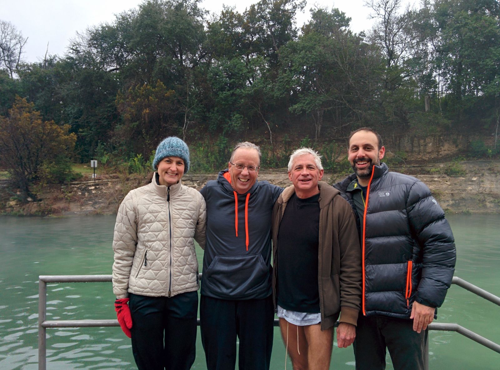 During the spring and summer of 2014, I trained–still in my wetsuit–in Barton Springs for an 11-mile open water swim. Each swim was more heavenly than the last. I decided to tough out the winter of 2014–swimming outside in my wetsuit–because I couldn’t imagine life without the Springs or my friends; I was hooked. What a glorious winter that was. I cherished every steamy, heavenly morning swim. I loved watching the cormorants dive like torpedoes as they fished.