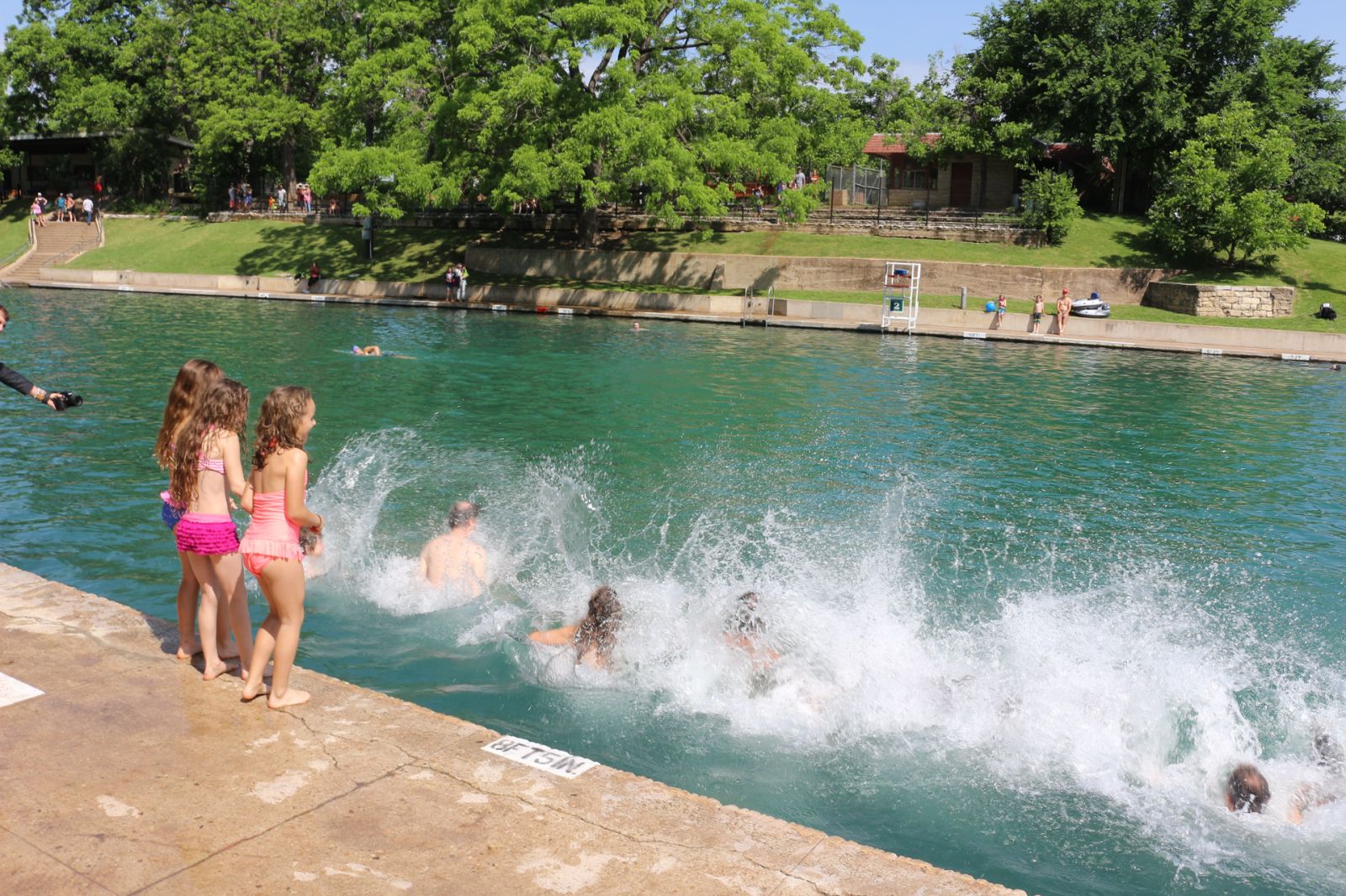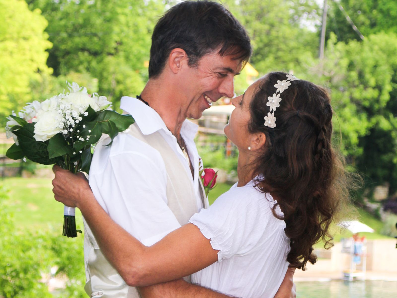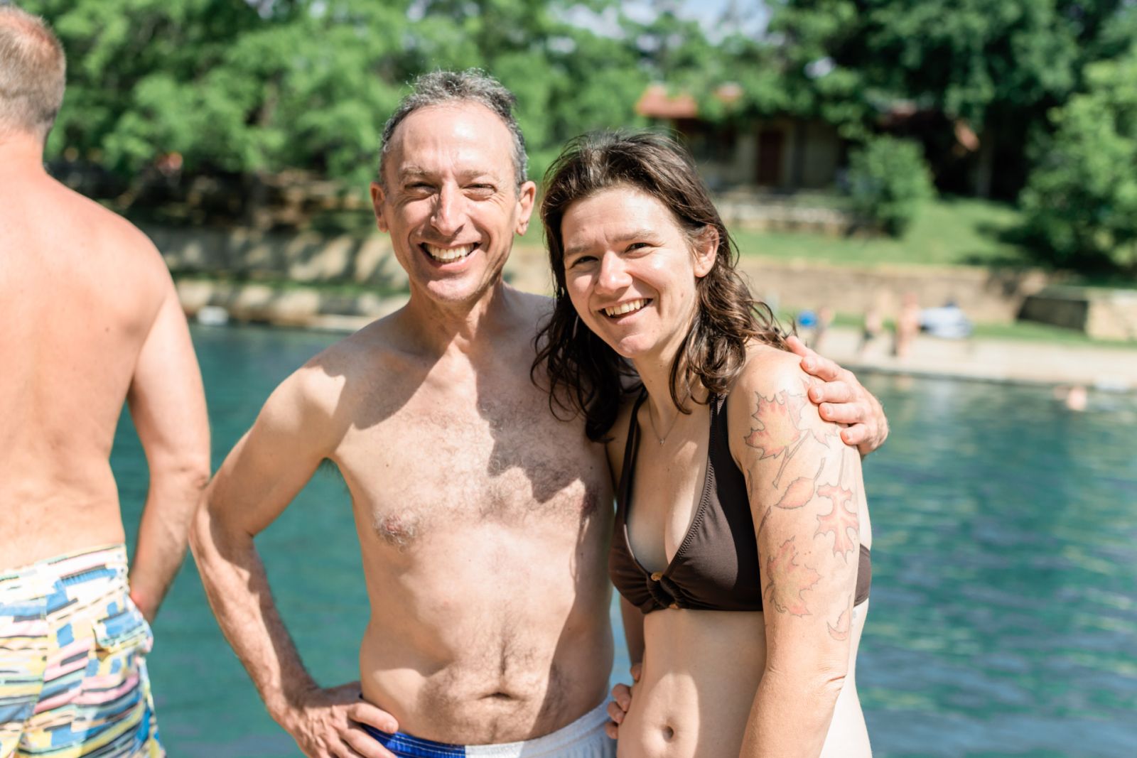 We had a simple barefoot ceremony surrounded by about 80 of our close friends and family under the pecan trees on the south hill overlooking the springs. RP Watson and Lance Harris played their ethereal music that is such a staple of the south hill, and we were married by Spike Gillespie. After the ceremony we walked down the sidewalk to the pool, lined up along the edge and jumped in the springs with most of our guests. Our good friends Dave Madden and Sarah Perez made a floating “Just Married” sign with strings of plastic bottles trailing behind that we swam off with. The whole thing was amazingly beautiful. The next day the sky clouded over again, and a week later the pool had flooded and closed once again.